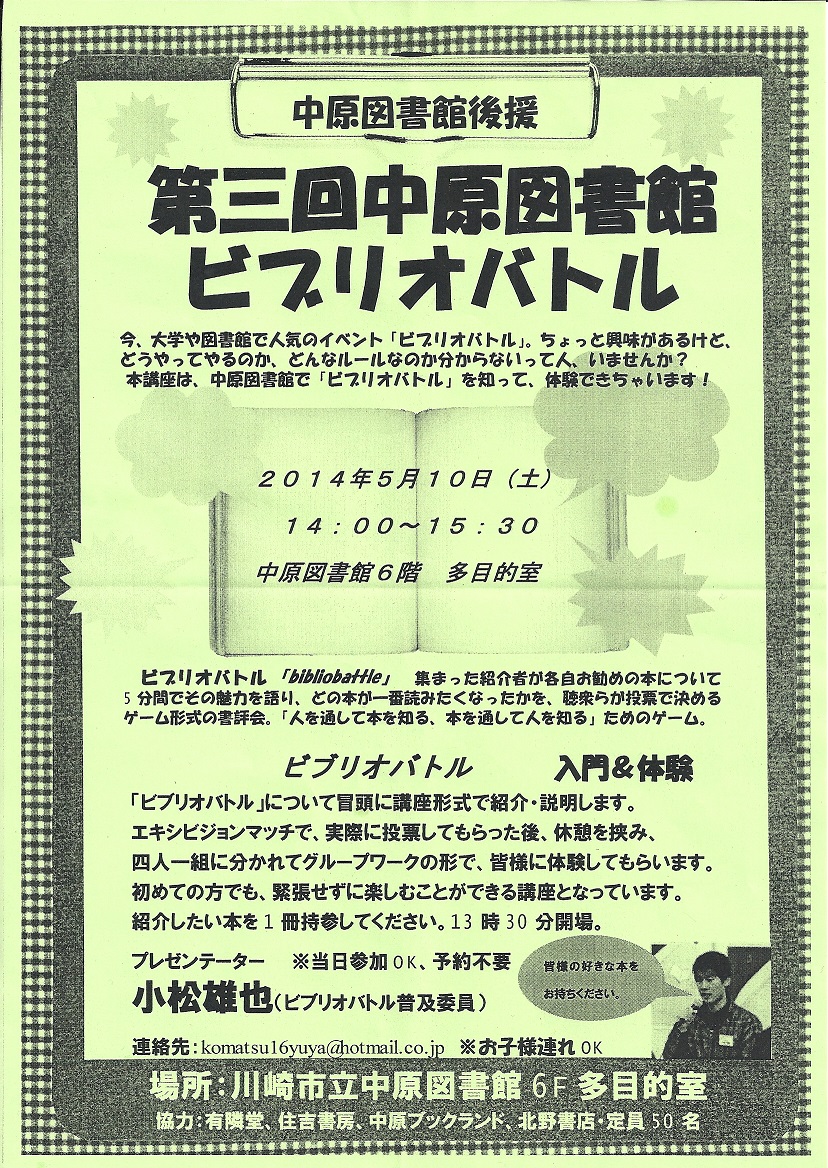 知的書評競技「ビブリオバトル」に参加することになった記念?に、ビブリオバトルのブログを立ち上げることにしました。バトルの様子や、紹介した本などを掲載していきたいと思います。